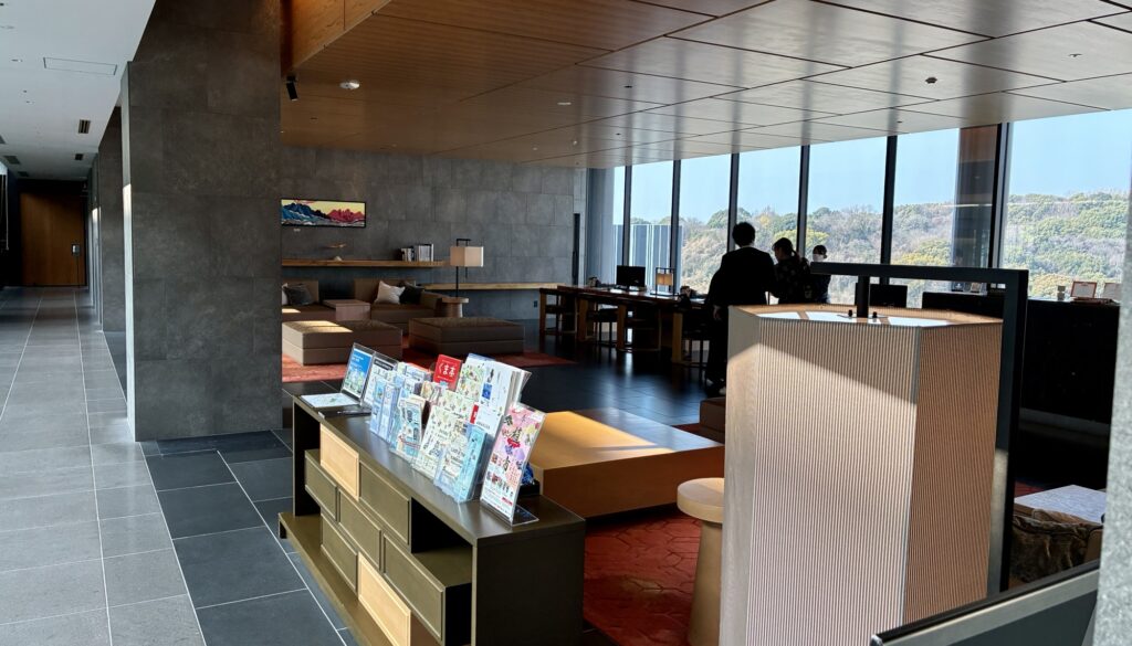エレベーターを降りてフロントロビーに入ると、広大な吹き抜けと熊本の自然をイメージした庭園がお出迎え。